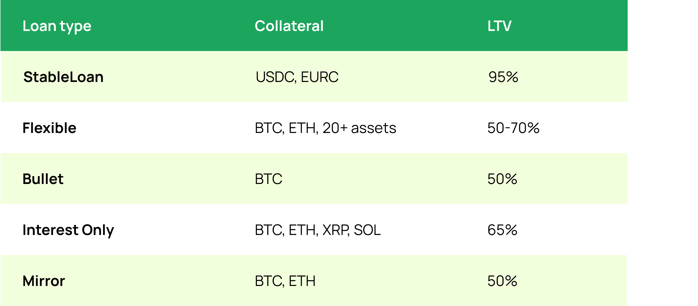 The StableLoan at 95% LTV stands apart because the collateral — USDC or EURC — doesn't fluctuate in value. The liquidation risk that applies to volatile assets like BTC and ETH is largely absent here. For everything else, the LTV tier you choose at origination directly affects how much market movement your loan can absorb.